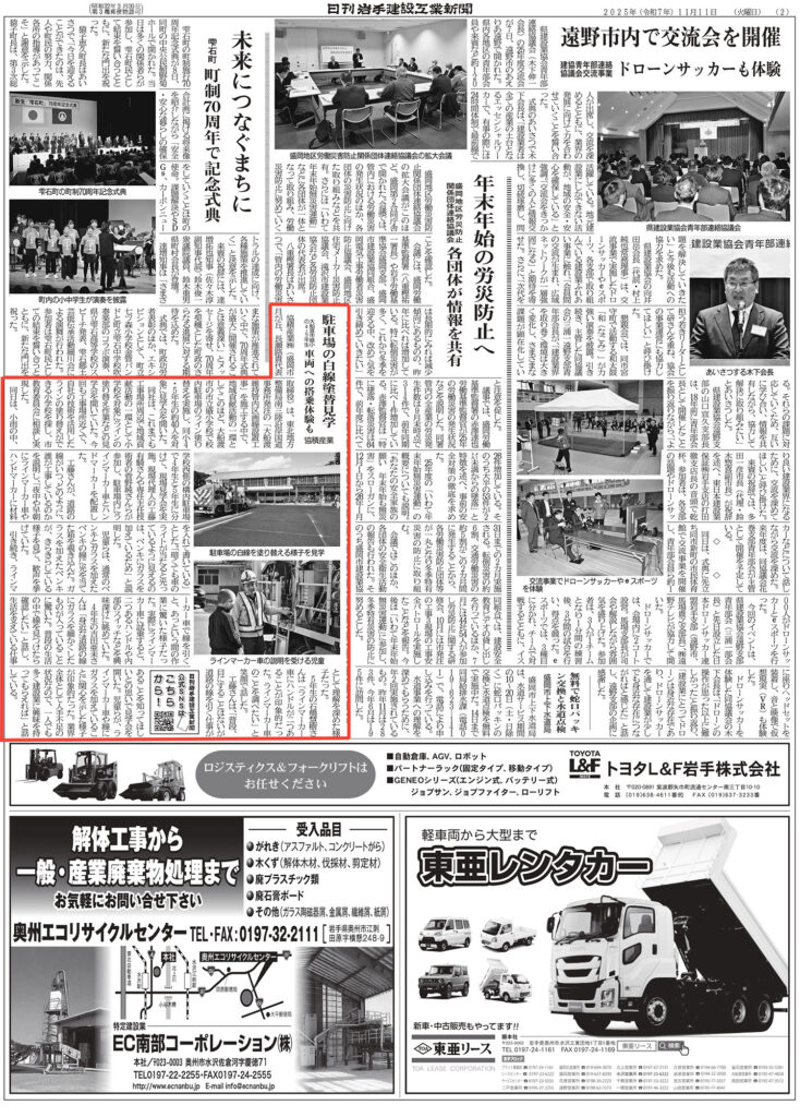先日、大船渡市立盛小学校で地域貢献活動の一環として、4年生・5年生の約40人を対象に校内駐車場のライン塗り替えの様子を見学していただきました。